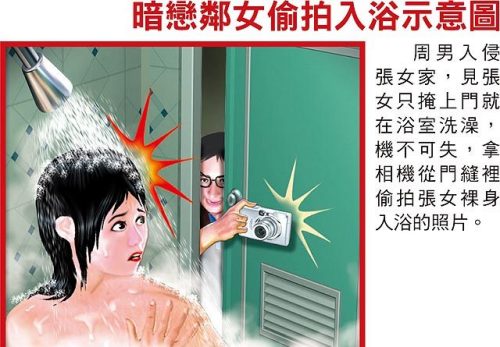 昨天凌晨一時許,周姓男子透過窗戶發現張女返家,便帶相機侵入其住處,張女正在浴室洗澡門未緊閉,周姓男子見機不可失,拿相機從浴室門縫連拍三張照,張女聽到快門聲發現被偷拍,嚇得尖叫,沖回房間穿衣、打電話通知母親報警。