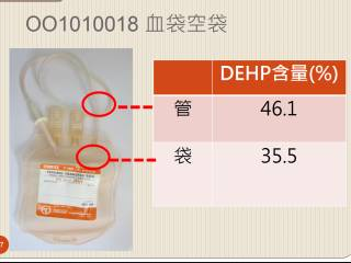 凌永健表示,以臺灣捐血中心血袋保存的數據顯示,只要血一入袋中,DEHP數值就會隨著時間增加,與一般正常人血液相比,最高甚至可達1000倍,數字非常可怕。除了DEHP之外,這份調查報告物中受測物品中的“點滴輸液套管”,也被驗出有29.1%比重的DINP,其它包括“綜合營養輸注套”、“廢液收集器”、“腎臟造口引流袋”等也被驗出20%到30%不等的高比重DEHP。