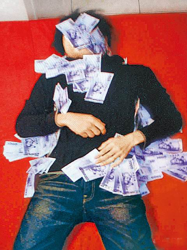 嫌犯陳詠霖將千元鈔撒滿身當被子蓋,炫耀詐騙財力。圖片來源:臺灣媒體
