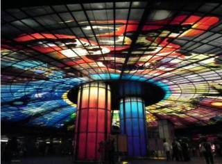 據(jù)報道,美麗島站是高雄地鐵最大站,同時也是目前世界上最大的圓形車站。其圓形設(shè)計出自日本設(shè)計師高松伸之手,以4000多片彩繪玻璃組成,用繽紛的色彩描繪浩瀚宇宙,被命名為“光之穹頂”,是目前世界上最大的單一玻璃公共藝術(shù)品。