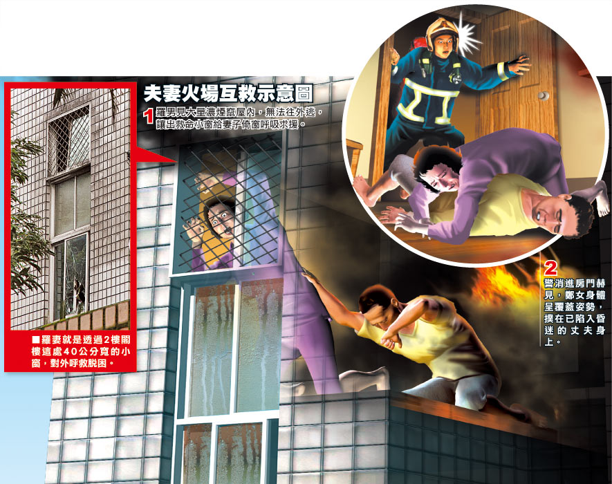 消防員表示,當時見鄭女呼救,因事態緊急,除先將鄭女下方窗戶擊破,讓屋內部分濃煙排出,再施以水霧防護,增加空氣中氧氣并降溫,讓鄭女有足夠空氣呼吸。同時間另一隊人馬則破門進入鄭女住宅,15分鐘便將火勢控制,但屋內仍濃煙密布,警消清查驚覺屋內還有個50公分寬的小樓梯,攀上樓聽見鄭女微弱求救聲,打開房門赫見,鄭女身體呈覆蓋姿勢、撲在已陷入昏迷的丈夫身上,她痛哭失聲頻呼:“快來救他啊!”消防隊員要求:“你還能走,快離開!”但鄭女卻說:“不要!我要等我先生啦!先救救我先生再說,好不好?”