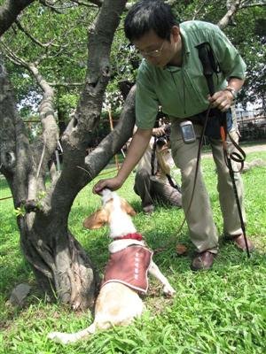 目前擔任屏科大工作犬訓練所訓練師的祁偉廉上午帶著2只米格魯到公園偵測罹患褐根病的樹木,祁偉廉拉著狗兒繞公園里的樹左一圈、右一圈,遇到感染褐根病的樹時,狗兒會在感染處坐下來,抬頭凝望祁偉廉,眼神像是個要糖的孩子,這時,祁偉廉會馬上從腰包里掏出食物以資獎勵。