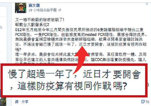 7月3日龐飛團隊在“最后一點剩余的腦乳劑”中,發現一些完整細胞,在臺大、家衛所雙重檢測后,上周末判定為陽性。“農委會”、“衛生署”昨日召開狂犬病專家會議,人醫、獸醫一致確診為狂犬病。