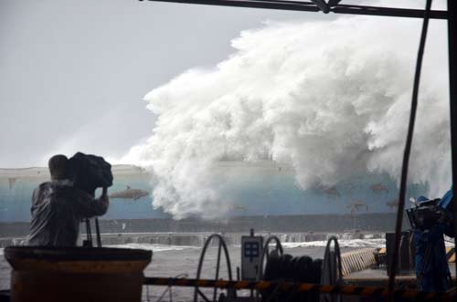 臺風(fēng)“天兔”來襲,臺東地區(qū)21日清晨風(fēng)強雨大,海邊掀起滔天巨浪,包括蘭嶼半個島總共6000戶停電,南回公路封閉。臺灣“中央社”圖
