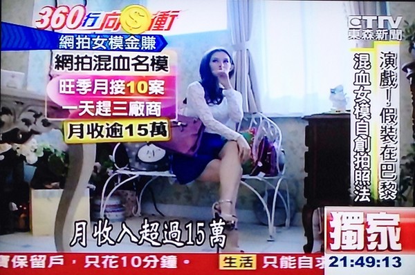 身高170公分的Sora林酉芯,雖然有四分之一荷蘭血統,卻是正港臺灣人,入行3年現在是超搶手的網拍界混血名模,要找她拍照一年前就要開始敲通告。碰到旺季,Sora一個月有十幾個活動,一天要連趕3場,月收入超過15萬元。 圖片來源:臺媒