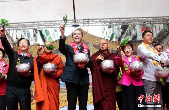 4月12日,新北市長朱立倫(左三)、臺“立法院”副院長洪秀柱(右二)出席新北市潑水節,參與“灑凈去厄”活動。中新社發 陳小愿 攝