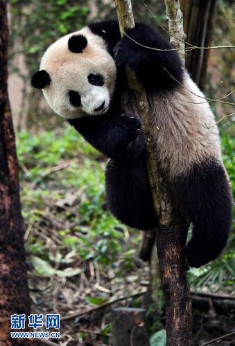 大熊貓“圓仔”在爬樹。新華社記者 張國俊 攝