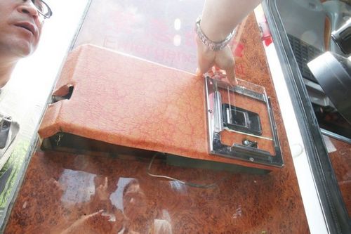 紅珊瑚車隊同款游覽車的安全門鎖,正常開啟方式,是得先取下壓克力板,才能開啟開關。(圖片來源:臺灣《聯(lián)合報》)