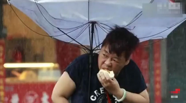 臺大媽臺風天吃包子照爆紅 雨傘"開花"照吃不誤
