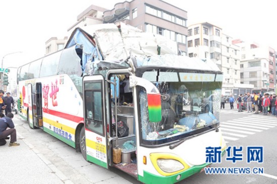 2月4日,一輛滿載大陸游客的游覽車在臺灣高雄市失控撞到路邊橋墩,造成車上多人受傷送醫。 新華社發