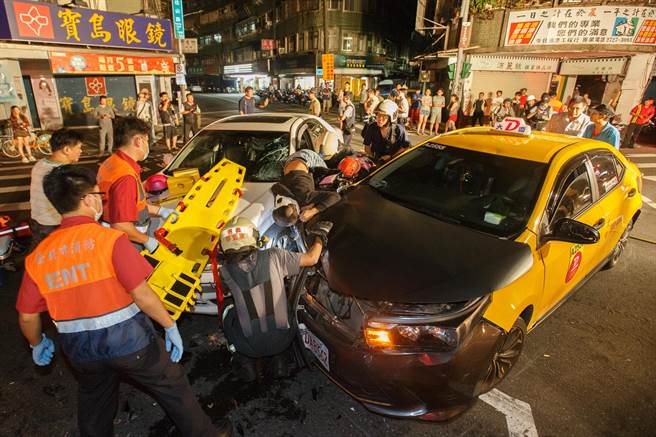 四周的路人也一同前來以人力將自小客車搬開,救護人員隨即將騎士送往北醫救治。(圖片來源:臺灣《中時電子報》)
