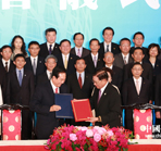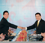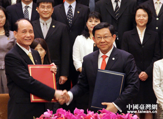 | 海協(xié)會(huì)會(huì)長(zhǎng)陳德銘與臺(tái)灣海基會(huì)董事長(zhǎng)林中森21日下午2時(shí)許在上海簽署了《海峽兩岸服務(wù)貿(mào)易協(xié)議》及其附件,這是兩岸兩會(huì)自2008年6月恢復(fù)制度性協(xié)商以來簽署的第19項(xiàng)協(xié)議。 |