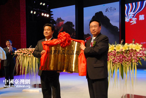 授牌儀式上,李亞飛向武當(dāng)山特區(qū)工委書(shū)記、管委會(huì)主任李發(fā)平授于“武當(dāng)山海峽兩岸交流基地”的牌匾。這是繼山東省棗莊市臺(tái)兒莊之后全國(guó)第二個(gè)“兩岸交流基地”。隨后,在武當(dāng)山進(jìn)山大門(mén)口,中共中央臺(tái)辦、國(guó)務(wù)院臺(tái)辦主任助理、海協(xié)會(huì)執(zhí)行副會(huì)長(zhǎng)李亞飛和湖北省副省長(zhǎng)田承忠為海峽兩岸交流基地揭牌。
