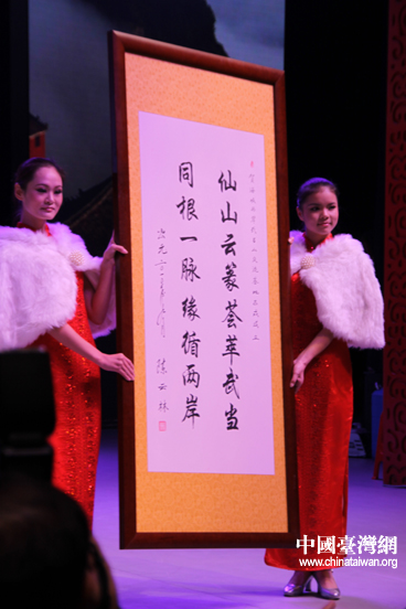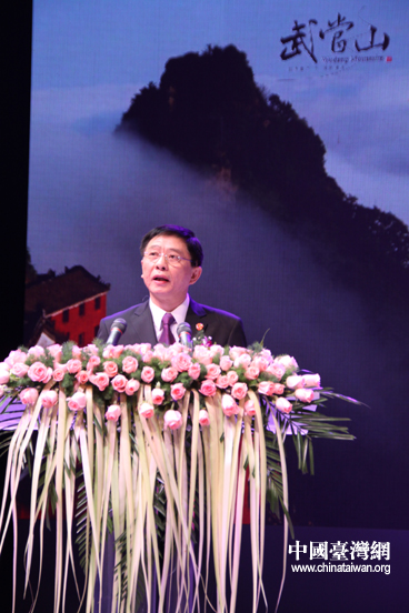 海峽兩岸關(guān)系協(xié)會(huì)會(huì)長(zhǎng)陳云林題詞:“仙山云篆,薈萃武當(dāng),同根一脈,源循兩岸”。(中國(guó)臺(tái)灣網(wǎng) 李丹 攝)