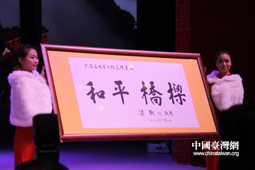 中國(guó)國(guó)民黨榮譽(yù)主席連戰(zhàn)為論壇題詞題詞:“和平橋梁”。(中國(guó)臺(tái)灣網(wǎng) 李丹 攝)