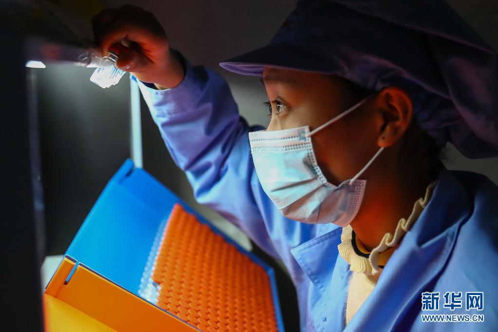 1月6日,科興中維的工作人員在包裝車間對西林瓶包裝新冠病毒滅活疫苗進行人工抽檢。新華社記者 張玉薇 攝