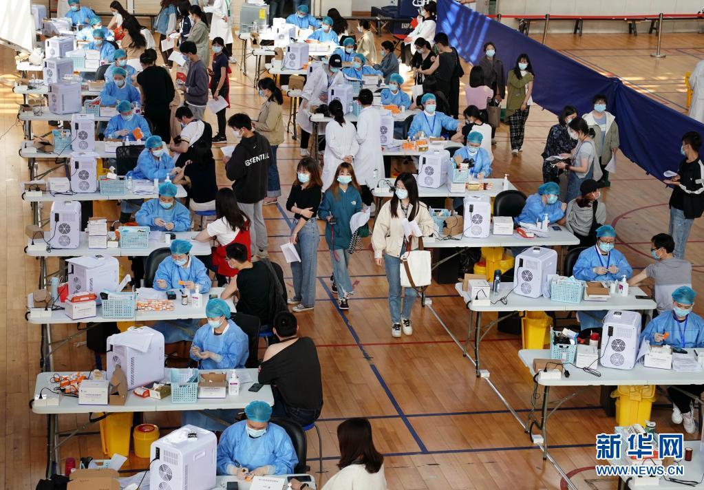 3月28日,在華東師范大學閔行校區體育館內,師生們在接種新冠疫苗。新華社記者 劉穎 攝