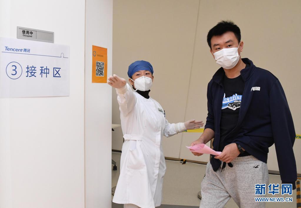 2月22日,在北京市海淀區中關村軟件園二期一家企業內的臨時接種點,醫護人員(左)引導企業員工接種新冠疫苗。新華社記者 任超 攝