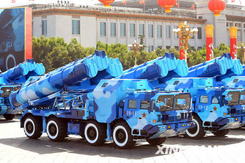 10月1日,首都各界慶祝中華人民共和國成立60周年大會在北京舉行。這是海軍岸艦導彈方隊通過天安門廣場。新華社記者李曉果攝