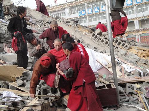 4月14日,玉樹縣結(jié)古鎮(zhèn)群眾在地震發(fā)生后的第一時(shí)間從廢墟中搶救出傷員。新華社發(fā)(張紅栓 攝)