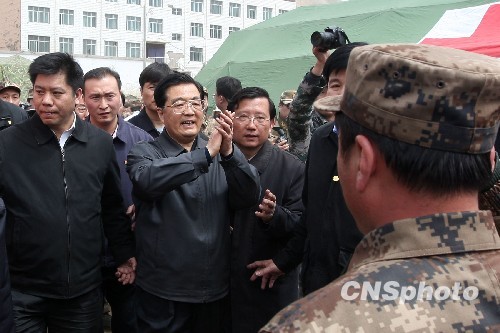 4月18日,中共中央總書(shū)記、國(guó)家主席、中央軍委主席胡錦濤飛抵玉樹(shù),看望慰問(wèn)地震災(zāi)區(qū)干部群眾,實(shí)地指導(dǎo)抗震救災(zāi)工作。 中新社發(fā) 盛佳鵬 攝