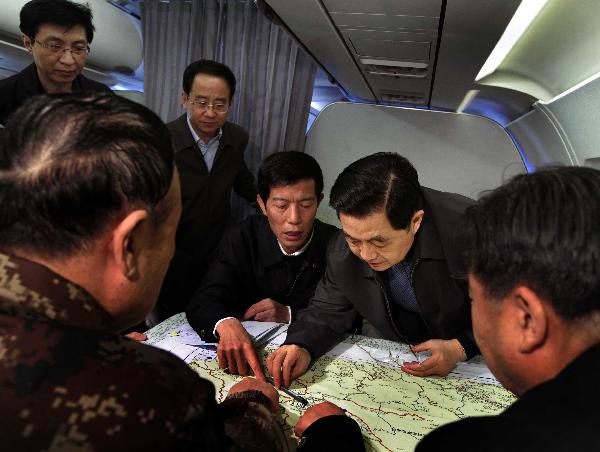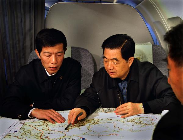 4月18日,中共中央總書記、國家主席、中央軍委主席胡錦濤乘飛機前往玉樹地震災區,看望慰問災區干部群眾,實地指導抗震救災工作。胡錦濤在飛機上察看玉樹災區地圖(4月18日攝)。 新華社記者蘭紅光攝