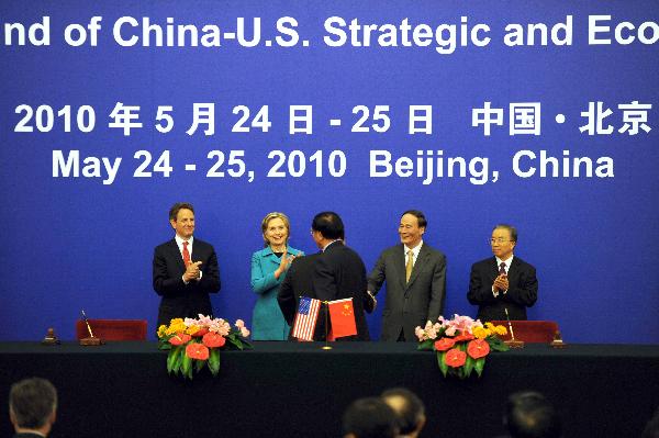 5月25日,中美雙方在北京簽署七項(xiàng)合作協(xié)議,涉及能源、貿(mào)易、融資、核能利用等多個(gè)方面。中國(guó)國(guó)家主席胡錦濤特別代表國(guó)務(wù)院副總理王岐山和國(guó)務(wù)委員戴秉國(guó),美國(guó)總統(tǒng)奧巴馬特別代表、國(guó)務(wù)卿希拉里·克林頓和財(cái)政部長(zhǎng)蒂莫西·蓋特納等參加第二輪中美戰(zhàn)略與經(jīng)濟(jì)對(duì)話的兩國(guó)高官出席了簽字儀式。新華社記者張鐸攝
