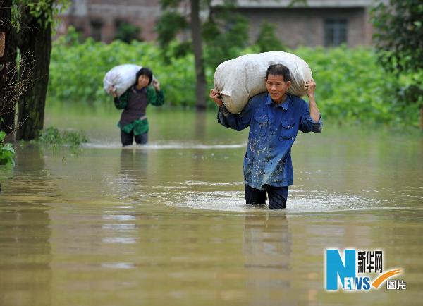 2010年6月2日,廣西忻城縣古蓬鎮上浪村,村民涉水搬運物品。攝影:新華社記者 周華