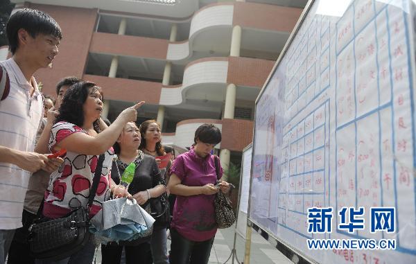 6月6日,考生和家長(zhǎng)在廣州市第七中學(xué)考場(chǎng)查看考場(chǎng)平面圖。 2010年全國(guó)高考將于6月7日舉行,廣州市的57個(gè)考場(chǎng)于6日下午3點(diǎn)至4點(diǎn)開放供考生踩點(diǎn),讓考生們提前熟悉考試環(huán)境和教室位置。新華社記者 盧漢欣 攝