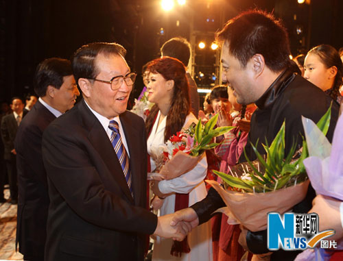6月11日晚,由北京大學(xué)歌劇研究院與中國歌劇舞劇院聯(lián)合推出的大型原創(chuàng)歌劇《青春之歌》在國家大劇院上演,中共中央政治局常委李長春出席觀看。這是演出結(jié)束后,李長春與演員親切握手。新華社記者 劉衛(wèi)兵 攝