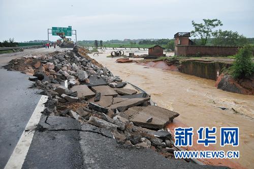滬昆高速垮塌現(xiàn)場(chǎng)(6月21日攝)。6月20日上午8時(shí)至12時(shí),因?yàn)檫B續(xù)多日強(qiáng)降雨導(dǎo)致白塔河決堤,洪水導(dǎo)致滬昆高速江西余江段4處垮塌,最大的垮塌處達(dá)50多米。目前,當(dāng)?shù)匾呀?jīng)組織1000多名工人,200多臺(tái)車輛進(jìn)行搶修,力爭(zhēng)21日天黑前實(shí)現(xiàn)通車。新華社記者 周密攝