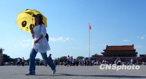 2010年7月5日,京城晴空萬里、驕陽似火。當日北京市氣象臺發(fā)布高溫橙色預警:受暖氣團影響,當日下午北京市大部分地區(qū)最高氣溫升至37℃以上,城區(qū)氣溫可達39℃至40℃。 中新社發(fā) 玉龍 攝