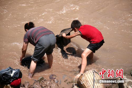 災(zāi)民在河中清洗被淤泥浸泡后的衣服。張浪 攝