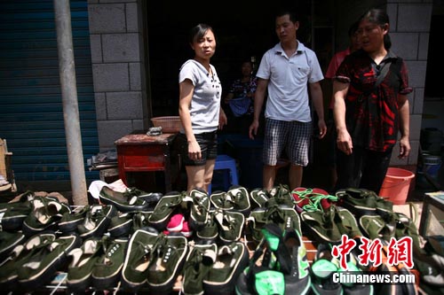 萬(wàn)源坪溪一零售鞋商老板曬自己清洗后的膠鞋。張浪 攝