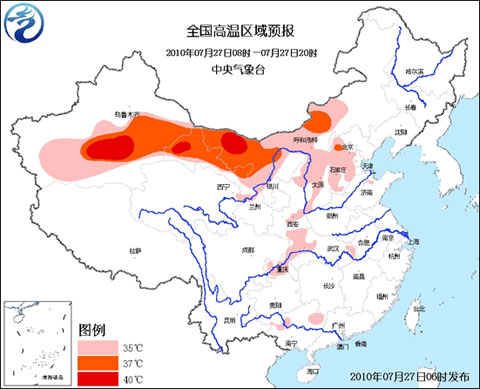 預計,今天白天,北京南部、河北中西部、山西大部、陜西東部、寧夏北部、重慶大部、湖北西北部和東南部、廣西中部等地有35℃以上的高溫天氣,局地最高氣溫可達37~38℃;內蒙古中西部、甘肅中西部、新疆吐魯番盆地及南疆盆地大部等地將有35~37℃的高溫天氣,局部地區最高氣溫可達40℃以上。