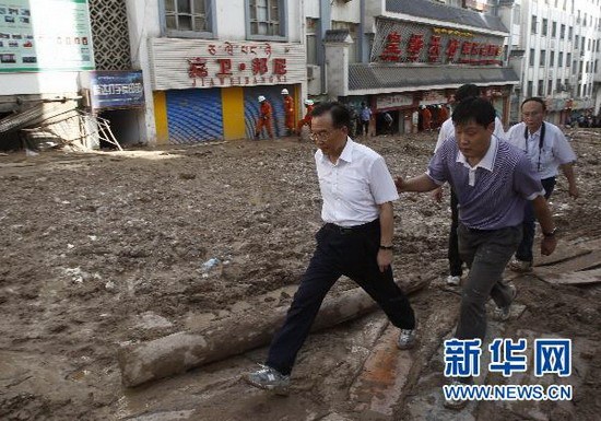 溫家寶踏碎石淤泥再赴舟曲重災區看望災民。