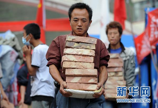 8月14日,志愿者在舟曲縣三中受災群眾安置點搬運磚塊。舟曲特大山洪泥石流災害發生后,當地群眾、正在放暑假的中學生、大學生組成的青年志愿者服務隊,每天從事著繁重的救災物資搬運、生活垃圾清理等搶險救災活動。 新華社記者 王鵬 攝