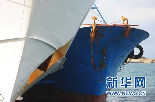 這張9月9日拍攝的照片顯示,在沖繩縣石垣港,被日本海上保安廳扣留,停靠在“與那國”號巡邏船旁的中國漁船(右)。新華社記者 季春鵬 攝