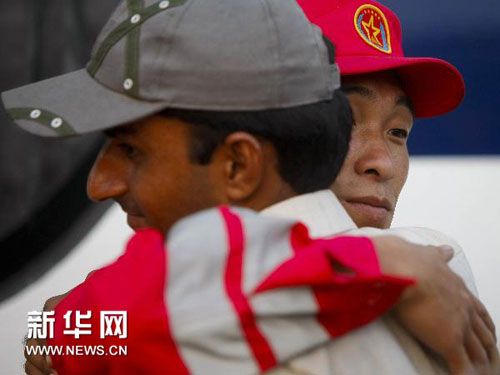 9月14日,在巴基斯坦南部特達(dá)地區(qū),準(zhǔn)備啟程回國(guó)的中國(guó)國(guó)際救援隊(duì)第一批隊(duì)員在駐地巴基斯坦工作人員相擁道別 周磊攝