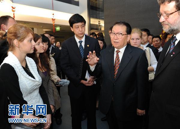 當地時間9月22日,中共中央政治局常委李長春在塔林出席塔林大學孔子學院揭牌儀式。這是揭牌儀式結束后,李長春與愛沙尼亞學生交談。新華社記者 馬占成 攝