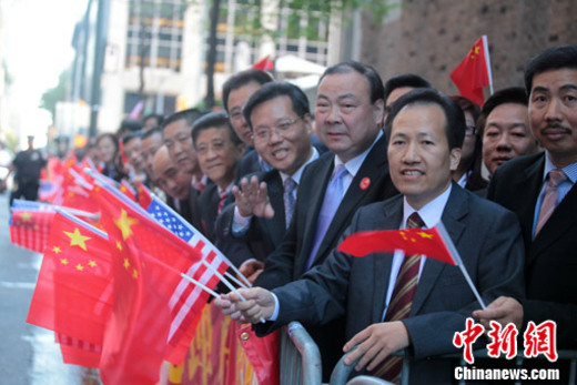 當(dāng)?shù)貢r間9月21日傍晚,3000多名當(dāng)?shù)厝A人華僑聚集在紐約公園大道,迎接前來出席聯(lián)合國會議的中國總理溫家寶。中新社發(fā) 魏晞 攝