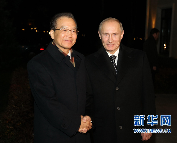 11月22日,國務(wù)院總理溫家寶在圣彼得堡與俄羅斯總理普京舉行小范圍會(huì)談并出席普京舉行的歡迎宴會(huì)。新華社記者鞠鵬攝