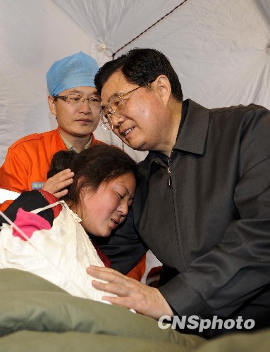 今年4月,由于中國青海省玉樹藏族自治州玉樹縣發(fā)生嚴重地震災(zāi)害,造成重大人員傷亡,國家主席胡錦濤在出席核安全峰會和“金磚四國”領(lǐng)導人第二次會晤并對巴西進行訪問后,推遲對委內(nèi)瑞拉和智利訪問,提前回國。圖為2010年4月18日,中共中央總書記、國家主席、中央軍委主席胡錦濤來到青海玉樹體育場地震災(zāi)民安置點看望受災(zāi)民眾和醫(yī)務(wù)人員。 中新社發(fā) 廖攀 攝