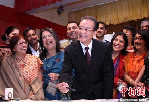 12月15日,正在印度訪問(wèn)的中國(guó)總理溫家寶參觀了泰戈?duì)枃?guó)際學(xué)校,并現(xiàn)場(chǎng)教印度學(xué)生書寫“中印友好”四個(gè)字。中新社記者 周兆軍 攝