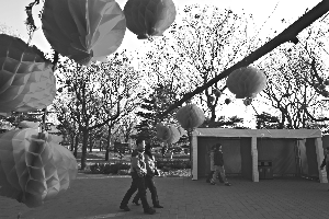 游人走過(guò)點(diǎn)綴著大紅燈籠的陶然亭公園。昨日廠甸廟會(huì)緊張籌備。本報(bào)記者 吳江 攝