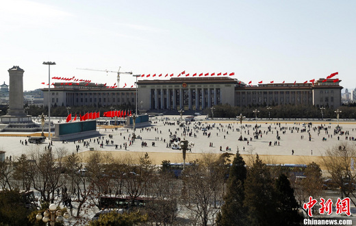 全國兩會召開在即,人民大會堂東門外的廣場上紅旗招展。中新社發 廖攀 攝