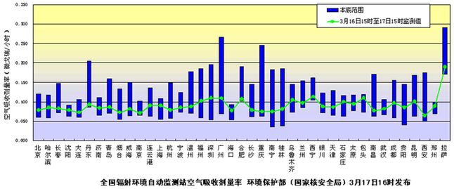 環(huán)境保護(hù)部(國家核安全局)3月17日16時(shí)繼續(xù)發(fā)布全國省會城市和部分地級市輻射環(huán)境自動監(jiān)測站實(shí)時(shí)連續(xù)空氣吸收劑量率監(jiān)測值。監(jiān)測結(jié)果匯總圖中綠色曲線代表監(jiān)測值,藍(lán)色柱體代表天然本底水平,綠色曲線均在藍(lán)色柱體范圍內(nèi)。監(jiān)測結(jié)果表明我國環(huán)境輻射水平未受到日本核電事故的影響。(來源:環(huán)境保護(hù)部網(wǎng)站)