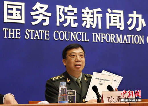 中華人民共和國國防部新聞事務局局長、國防部新聞發言人耿雁生大校,3月31日在國務院新聞辦公室介紹中國發表《2010年中國的國防》白皮書的相關情況與解放軍四總部相關軍官回答中外記者提問。中新社發 宋吉河 攝