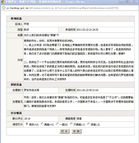 “羅定市行政電子監察大廳”運行4年來,收到群眾來信近5000條,一度名聲在外。剛開始運行時,市民反映的問題和答復,任何人都可以看到,現在卻有不少答復說:“您所提交的信訪件,已處理完畢,由于不便公開,我們將通過電話或郵件的方式回復您,或者您可以通過下方的業務編碼查詢查看處理結果。”