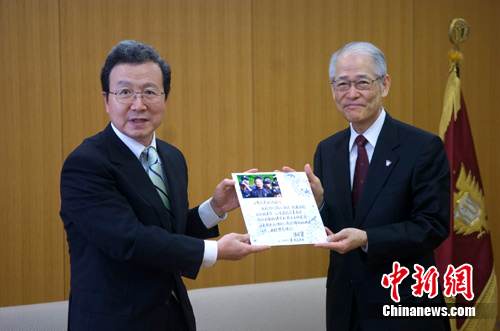 2011年5月13日,中國駐日本大使程永華向上智大學轉交了溫家寶總理親筆信。圖為程永華(左)和上智大學理事長高祖敏明(右)。中新社記者 孫冉 攝